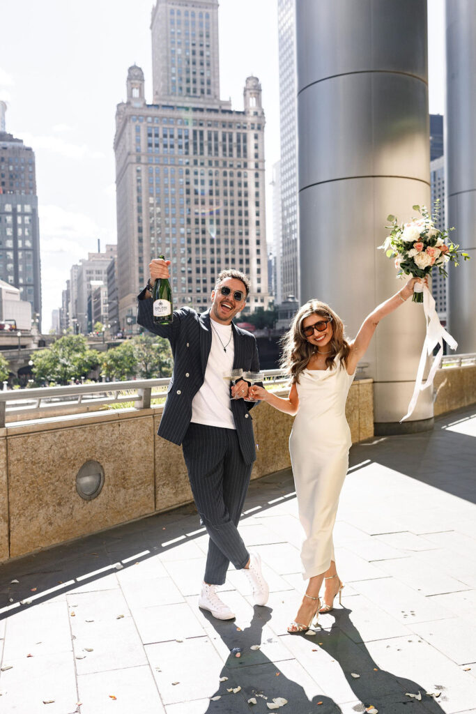 Newlyweds and friends celebrate with champagne after eloping at city hall.