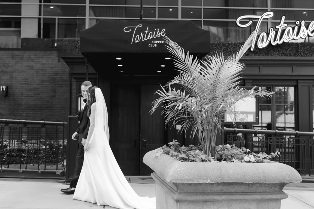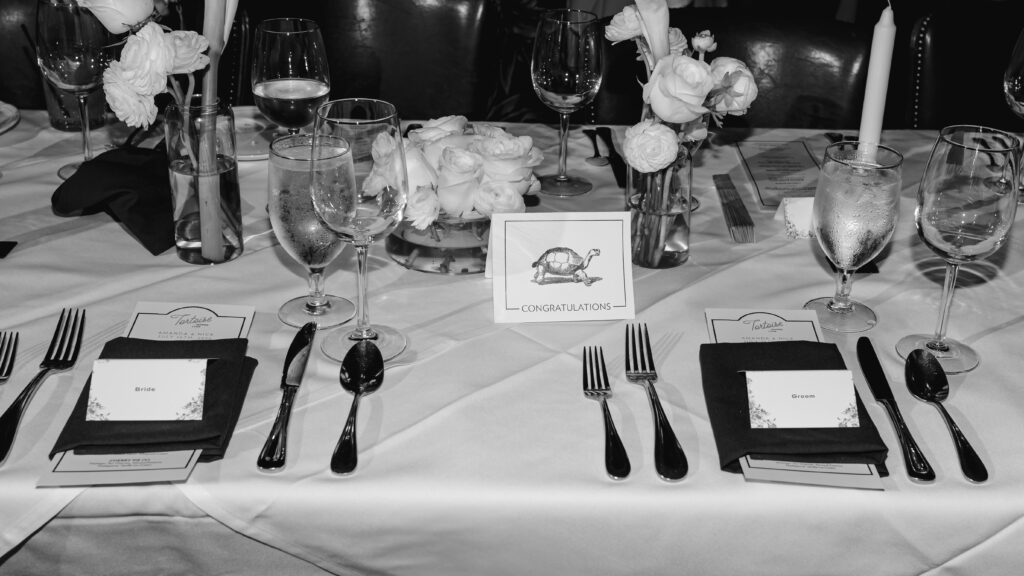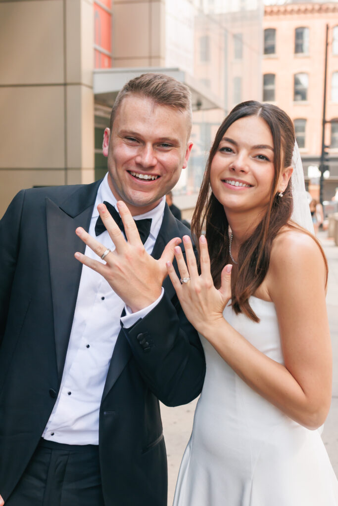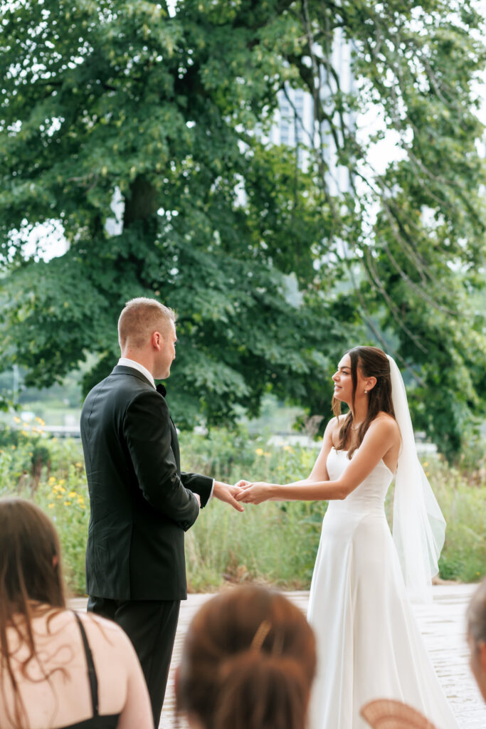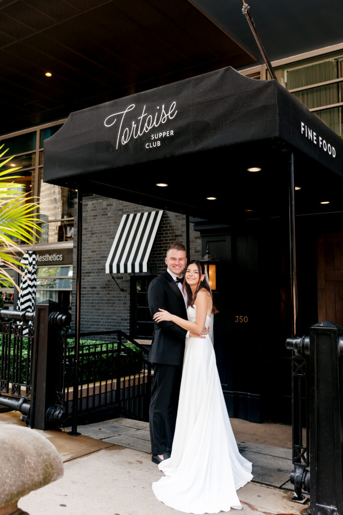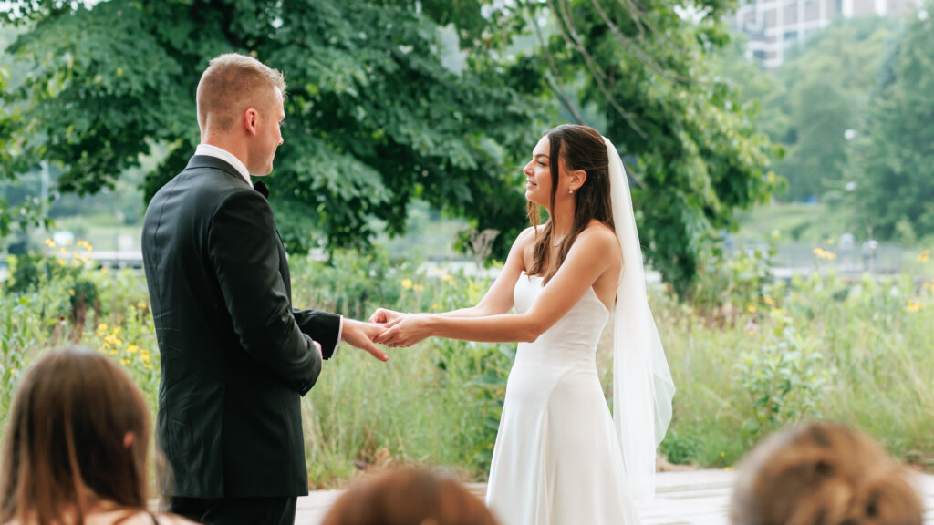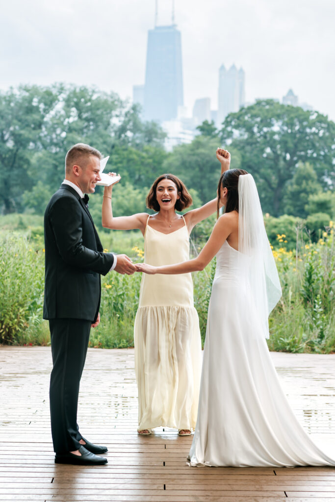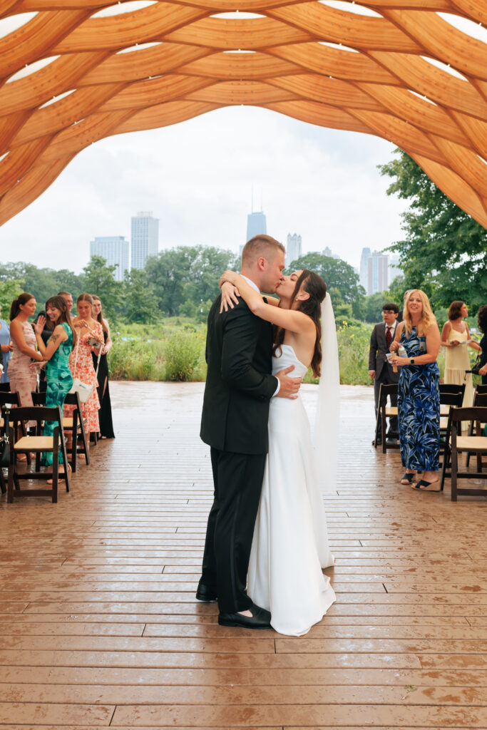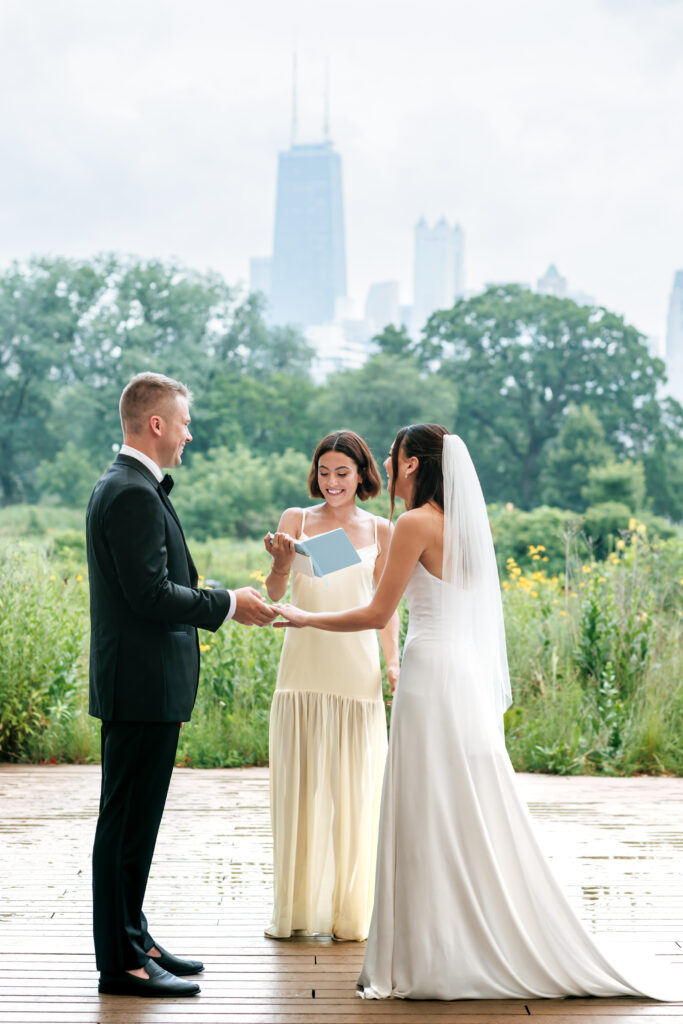 Amanda’s sister led their Lincoln Park Honeycomb ceremony, filling it with laughter, love, and the perfect personal touch. They broke the glass with big smiles, honoring Amanda’s Jewish heritage in a moment that felt both joyful and grounding. After the ceremony, they shared cocktails and dinner at Tortoise Supper Club, their favorite moody River North date-night spot. Just before sunset, they slipped away for golden hour portraits by the river. Amanda changed into a chic second dress as the light turned golden. Their day was the kind of intimate Chicago wedding that blended meaningful traditions with the beauty of the city—rain and all.